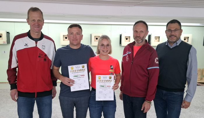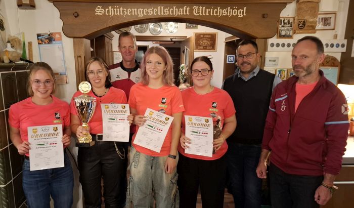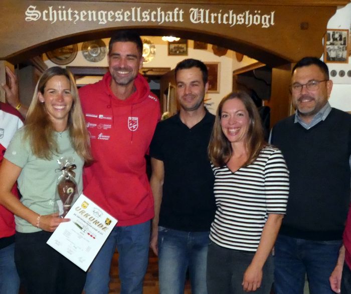 ![]() v.l. Damen-Gemeindemeister SG Ulrichshögl 1 mit J. Nitzinger, L. Benger, A. Eschlberger, Th. Wimmer, 1. Bürgermeister Martin Öttl, 1. SGU-Schützenmeister A. Huber, im Hintergrund SC-Vorstand Olaf Tanner |
