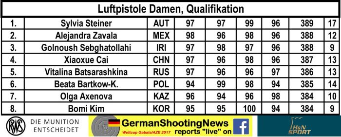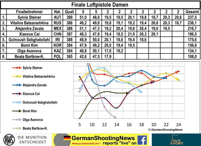 Beim Kampf um den Einzug in das Goldfinale gelang ihr mit dem 22. Schuss eine hervorragende 10,7. Mit diesem Schuss konnte sie die Mexikanierin um 0,2 Ringe auf den 3. Platz verweisen. Der Abstand zur führenden Russin betrag vor den letzten beiden Schüssen jedoch nur 0,5 Ringe. Mit einer 10,0 und einer 10,6 (20,6 Punkte) zeigte sie, gegenüber ihrer Konkurrentin (18,7 Punkte) enorme Nervenstärke und gewann damit den Weltcup Luftpistole in Gabala.
