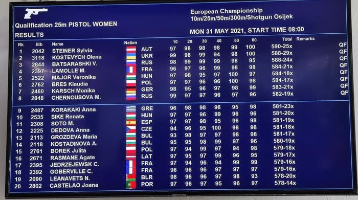 Am 31.05.2021 startete sie dann mit der Kleinkaliber Sportpistole den letzten Wettkampf im Rahmen der EM 2021.