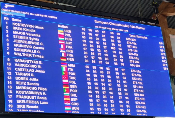 Ein tolles Ergebnis, das sie ringglich mit der drittplatzierten Veronika Major (HUN) auf den vierten Rang der Qualifikation brachte. Dabei schoss die Heeressportlerin durchwegs solide Serien und ließ in Serie fünf mit unerreichten 100 von 100 möglichen Ringen aufhorchen. 577 Ringe liegen knapp unter ihrem Saisonschnitt. Steiners Rekord steht seit dem Weltcup Osijek im vergangenen Jahr bei 580 Ringen. Als Führende schloss Olena Kostevych (UKR) mit 585 Ringen diese Qualifikation ab.